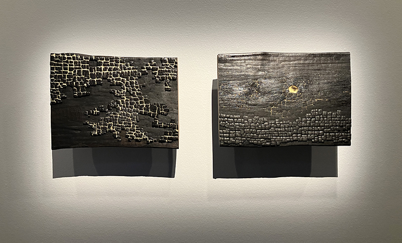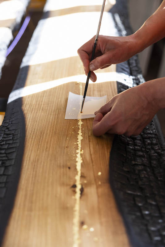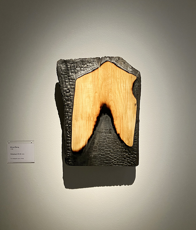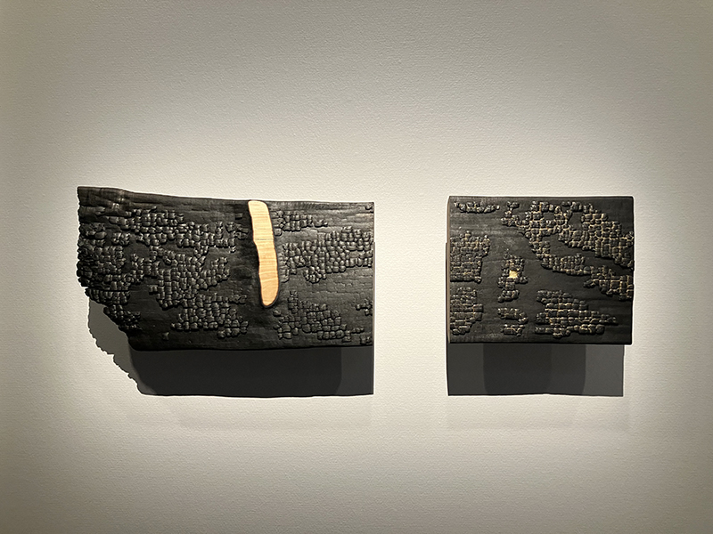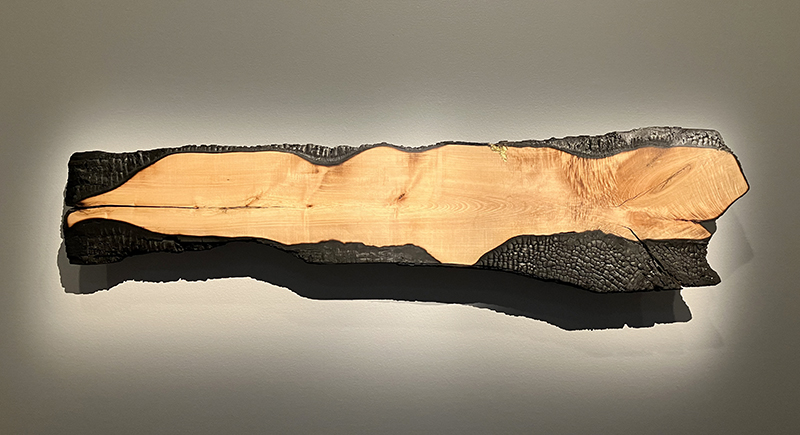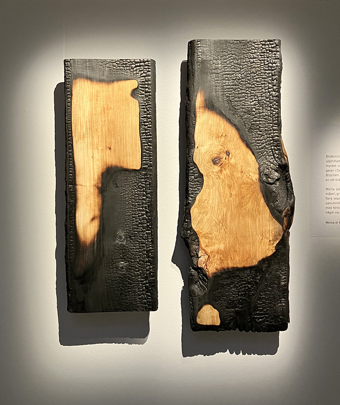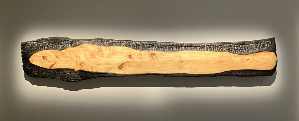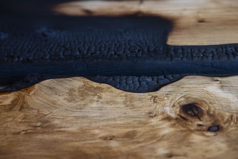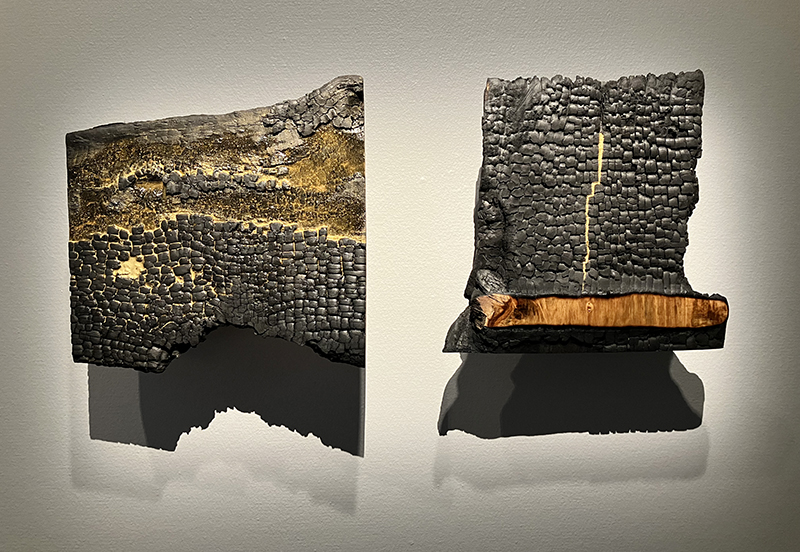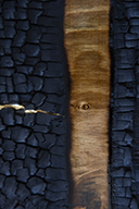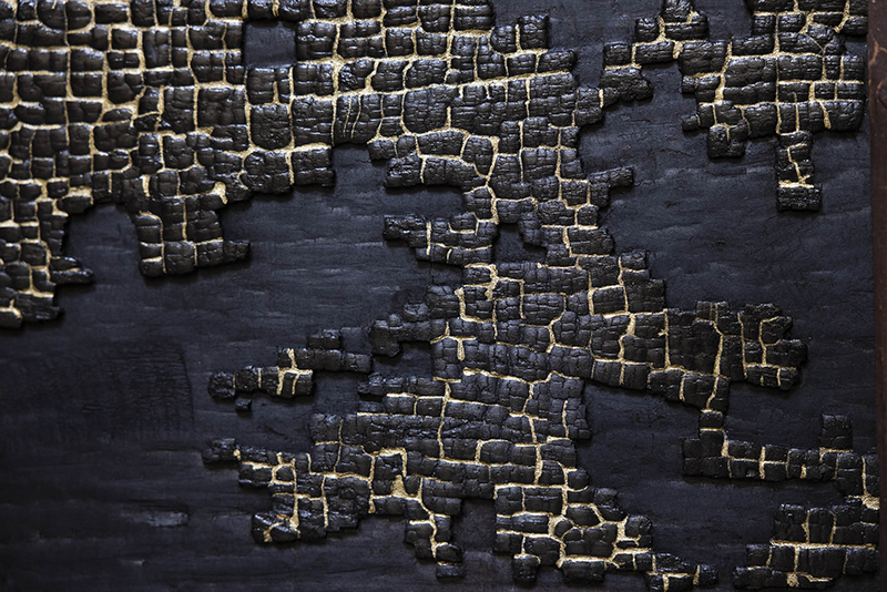I förkolnat virke som blev kvar efter en brand har jag lyft fram det krakelerade mönstret och delvis förgyllt det inspirerad av den japanska kintsugimetoden. En oförstörd gyllene kärna har slipats fram.